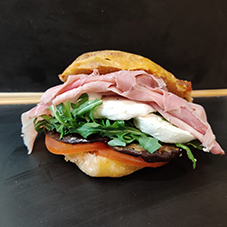 Pain aux tomates séchées - Jambon cru de Parme - Scamorza fumé - Mayonnaise - Salade rucola - Tomates séchées - Truffe (Huile) - Basilic - Aubergines grillées