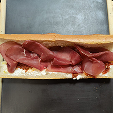 Baguette - Bresaola I.G.P viande de boeuf - Chèvre frais - Citron huile - Tomates séchées - Poivre