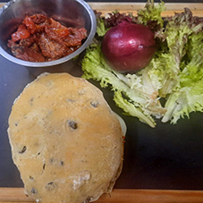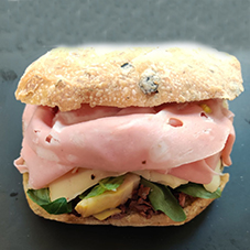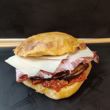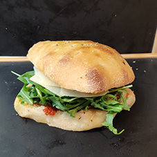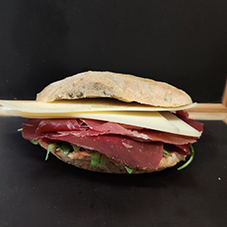 Pain aux olives - Bresaola I.G.P viande de boeuf - Provolone piccante - Moutarde - Salade rucola - Truffe (huile) - Tomates séchées