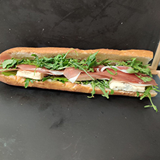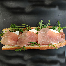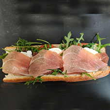 Baguette - Jambon cru de Parme DOP - Mozzarella di Bufala DOP - Salade rucola - Tomates fraîches - Poivre - Huile d’olive extra vierge