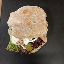 Pain aux olives - thon - provolone nature - mayonnaise poivre - oignons - piment - tomates séchées