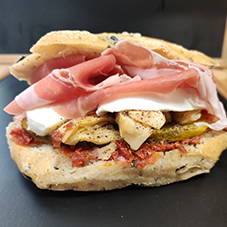Pain aux olives - Jambon cru de Parme DOP - Mozzarella di Bufala DOP - Poivre - Truffe (huile) - Cornichons - Tomates séchées - Artichauts
